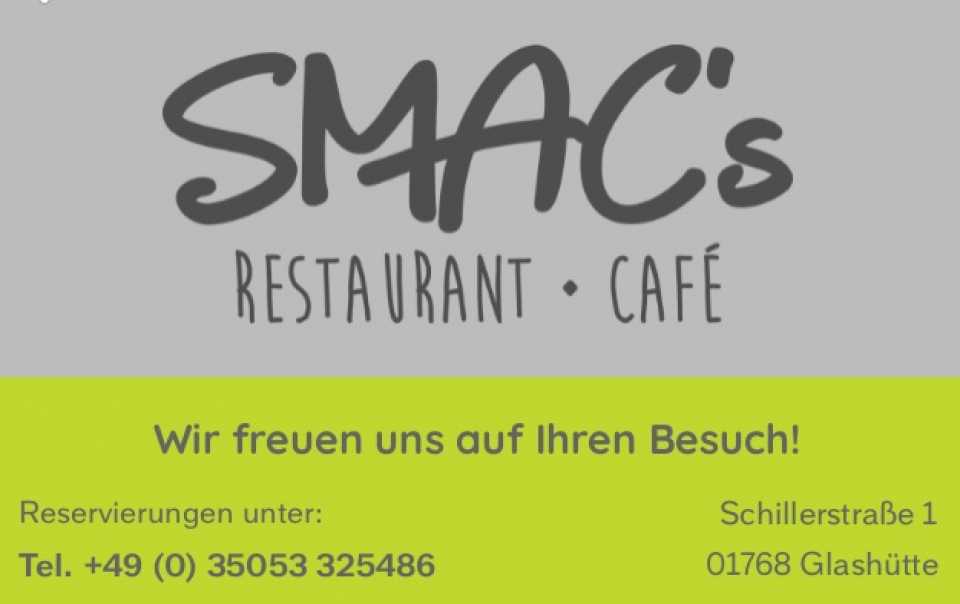 SMAC's Restaurant und Café - die erste Adresse im Uhrenmekka Glashütte! Unser Restaurant und Café ist in einem modernen Ambiente eingerichtet und liegt zentral in Glashütte direkt neben dem Uhrenmuseum. Mit 40 Sitzplätzen im Innenbereich und weiteren 30 Sitzplätzen im Außenbereich haben wir ausreichend Platz für Familienfeiern und Firmenevents. Außerdem bieten wir einen individuellen Cateringservice. Qualität steht bei uns immer im Mittelpunkt.